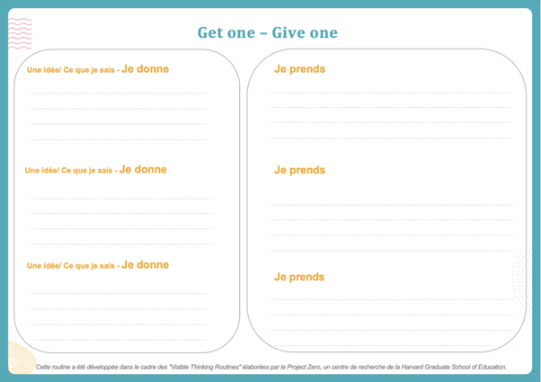 " Je prends - Je donne" ("Get onte - Give one") encourage les élèves à partager leurs réflexions à plusieurs reprises au cours de la séance, favorisant ainsi des discussions riches et variées.