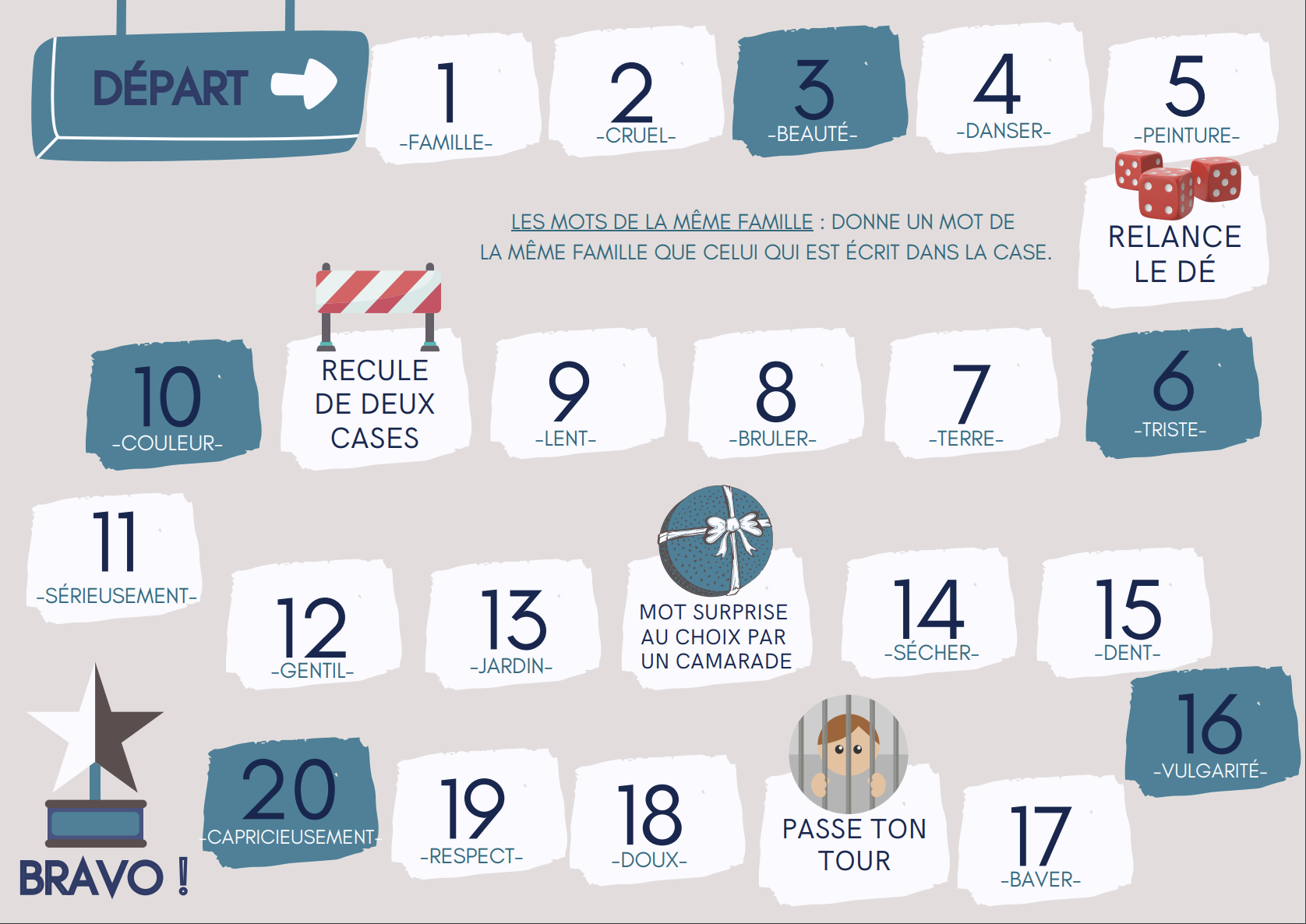 a) Ils vont tous commencer à la case départ, puis lancer le dé à tour de rôle. Le but est de trouver un mot de la même famille que celui écrit sur la case. S'ils se trompent, ils retournent à la case précédente ; s'ils disent juste, ils peuvent rester sur leur case. Chaque élève joue à tour de rôle.