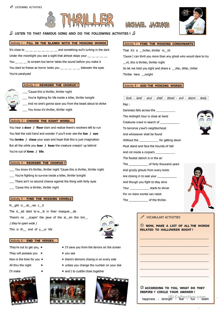 Activités diverses par paragraphe autour de la chanson "Thriller" de Michaël Jackson  (youtube).
